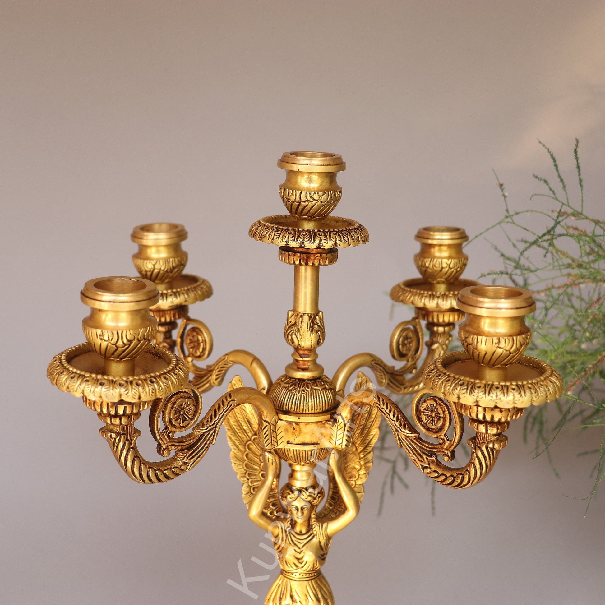 Crafted in solid brass, this candle stand is more than just a utility. With its finely carved details, it reflects an age-old tradition of metal artistry. The angelic figure at the center holding up the arms adds an element of divine charm, while the multiple holders allow you to create a warm, radiant glow in your room.